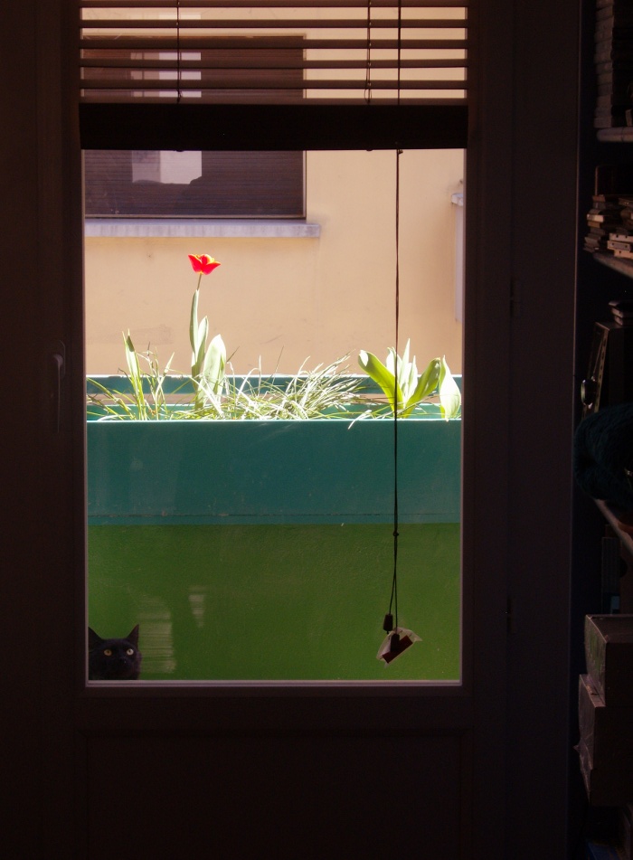 // J’ai immortalisé la seule tulipe qui a fleurit sur notre balcon cette année // Et Alfred, toujours dans les parages .. //
