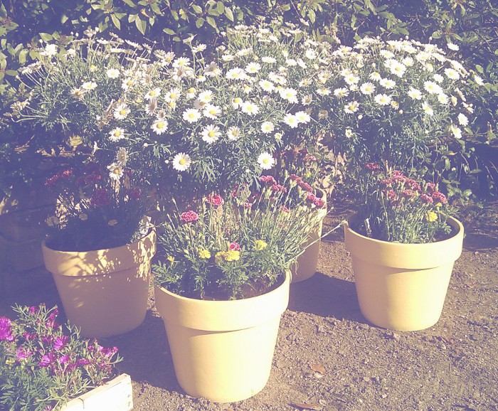// Nous avons peint des pots et planté des fleurs // Agathea, anthemis, oeillets … de quoi égayer la terrasse de ma belle-mère .. //