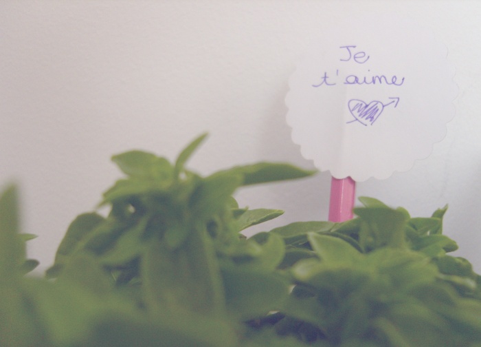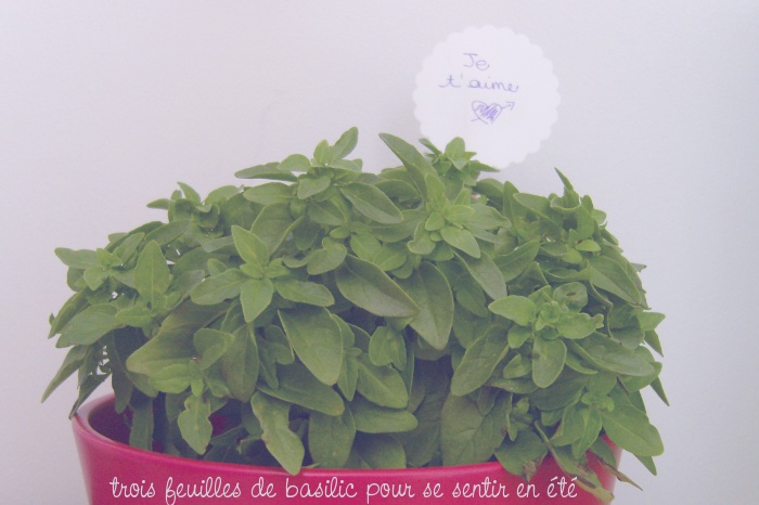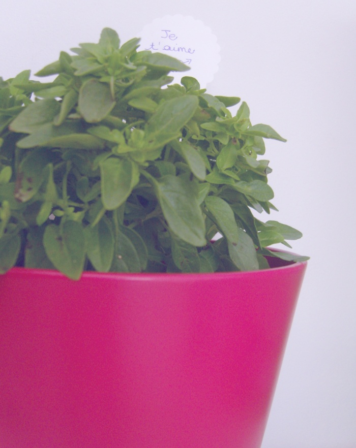 Parce qu’il sait que ces derniers temps je suis un poil stressée et que j’aurai été grandement tentée de profiter de mon célibat pour me cacher sous ma couette en attente de jours meilleurs, il a rempli notre frigo de tout plein de bonnes choses dont je suis friande. Et ramené un bébé plant de basilic pour égayer mes assiettes de parmesan aux pâtes ! Lequel a désormais pris place sur mon bureau pour me donner l’eau à la bouche à des heures correctes et ainsi me pousser à faire chauffer une casserole d’eau – en cas de fainéantise aiguë de cuisine – (les pâtes sont toujours salvatrices).