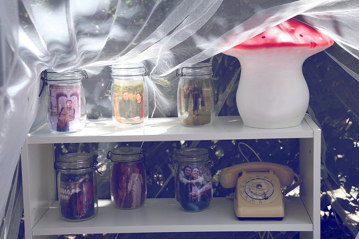 {moustiquaire, tapis, meuble: ikea // cantine: merlin the king // livres de contes: cyprien + emmaüs // socotel et lampe champignon: à moi // photos dans les bocaux: imprimées, découpées puis rangées. }