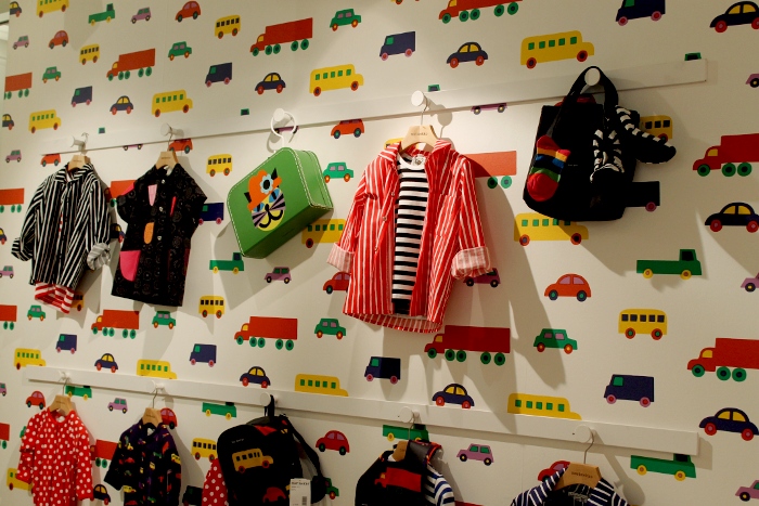 Pour commencer, la boutique est hyper classe avec la collection à venir. Normal, me direz-vous. Tout donne envie, jusqu’au papier peint pour les enfants. Les poufs, la vaisselle, les mugs, les mètres de tissus, etc. Je me souviens encore de l’expression de mon regard quand je montrais avec joie toute nouvelle découverte à Cyp et que celui-ci ne faisait que répéter: « gnagnagna, tu verras bien, c’est toi qui portera, je te rappelle que ton sac pèse déjà 14kg, gnagnagna, je ne dis pas non mais.. non. »