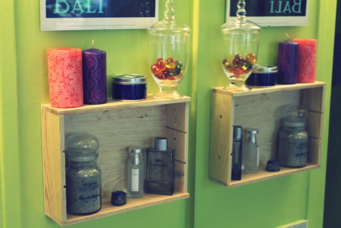 Bref, le vin du C.E. a fini sa route dans un bon boeuf bourguignon (entre autres) et la caisse dans le dépotoir de notre troisième chambre. Jusqu’à ce que mes deux neurones décident de bosser un peu et c’est ainsi que depuis quinze jours, la salle de bain arbore fièrement un chouette élément décoratif. Qui plus est, va avec le reste de la déco choisie.