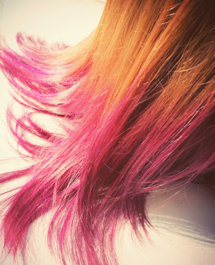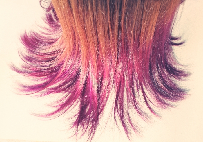 Ne me demandez pas en quoi c’est plus facile de se lancer dans un ombré hair violet plutôt qu’un traditionnel. Je n’en sais rien. Peut-être parce qu’à l’âge de 16 ans, j’ai déjà arboré de vraies mèches violettes dans mes cheveux ? Quoiqu’il en soit, dès que j’ai reçu mes petites bouteilles de coloration semi-permanente, j’ai sauté le pas. Et j’aime beaucoup le résultat, le dégradé, les pointes.. TOUT.