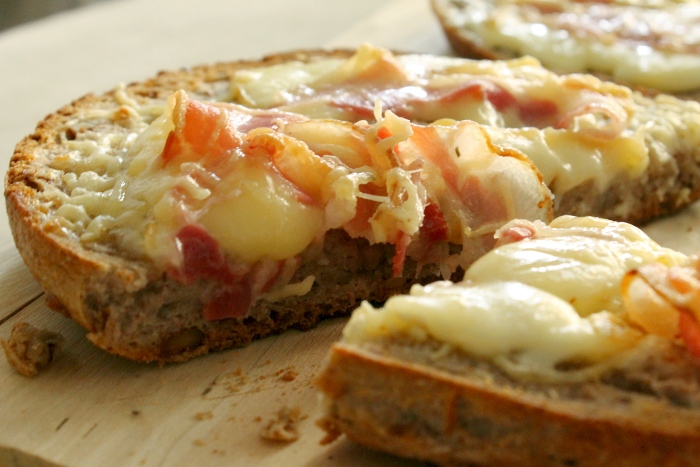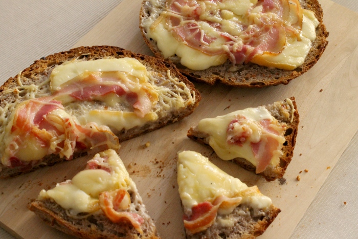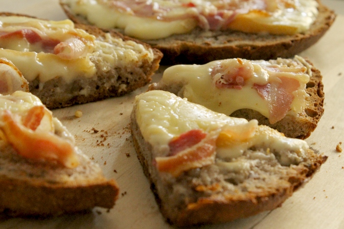 Attention, ça va vite : on découpe la miche en tranches dans le sens horizontal. On frotte les tranches avec la gousse d’ail. On nappe de crème fraîche. Sel, poivre, etc.
