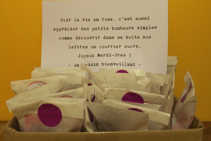 Mercredi des Cendres, c’est trop morbide à mon goût. Et puis vous me connaissez, je suis toujours en retard  dans la publication de mes articles et donc … Initialement, pour Mardi Gras, j’avais prévu de mettre des confettis dans les boîtes aux lettres mais Cyprien me l’a strictement interdit. Alors avec Alfred, nous avons eu une autre super idée …