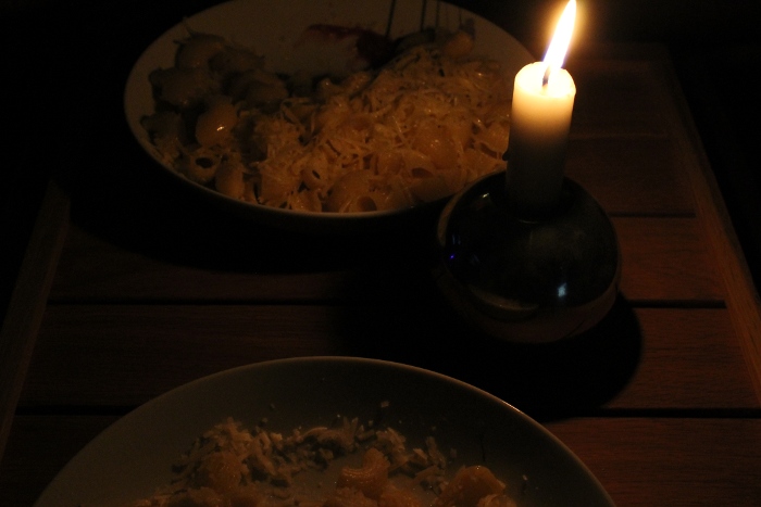 Pour ce fextravrier, j’ai voulu passer une soirée sous la lumière des bougies et de ces étoiles. Une soirée en amoureux, en quelque sorte. Anodine certes, mais tellement simple et joviale ! Depuis le we sans électricité, je rêve de consacrer plus de soirées de ce genre à notre couple. Juste le simple fait de ne pas allumer les lumières mais de s’éclairer à la bougie pour préparer le repas, manger, papoter tranquillement et puis voilà. Je n’en demande pas plus. Seulement de revenir à des choses beaucoup plus simples et prendre le temps d’apprécier des instants magiques à peu de frais. Même si ce n’est qu’une banale assiette de pâtes au parmesan ! Sans oublier un peu de musique, bien évidement  ..