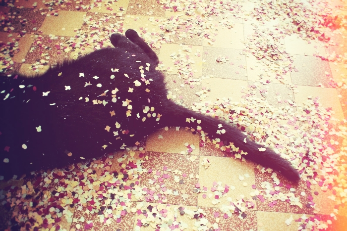 P.S. : ça glisse, les chats, quand ça court à travers les confettis et c’est bien marrant .. !