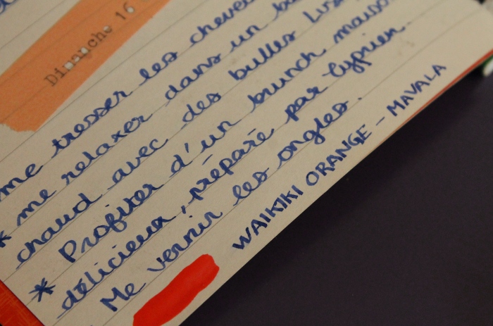 Tous les jours, au fur et à mesure, notez tous ces petits bonheurs qui enjolivent votre quotidien. Du délicieux chai latte au mec mignon qui vous a souri dans le métro en passant par les compliments reçus. Notez toutes ces pépites qui font voler nos papillons intérieurs mais que l’on oublie souvent en fin de journée à cause de la fatigue et des mauvais moments.