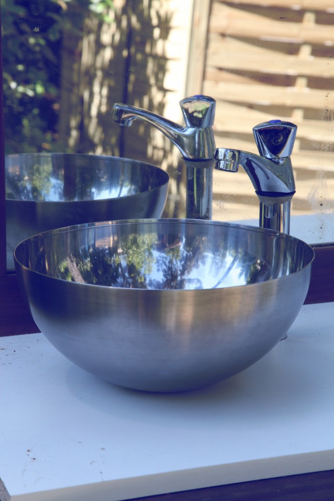 Les belles vasques coûtant la peau des fesses en magasin, nous avons triché en prenant des saladiers en inox de chez ikea que nous avons ensuite percés pour installer le vidage. Ni vu ni connu !!