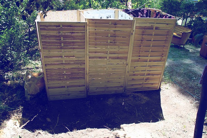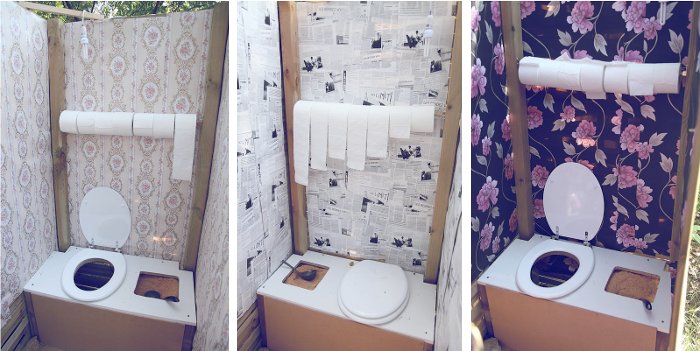 Voici donc nos trois cabinets conçus d’après les toilettes sèches des scouts. Avec sciure, assises et éclairage. Le luxe total !