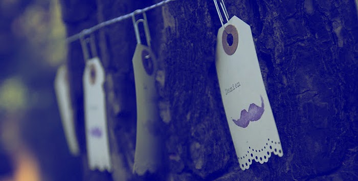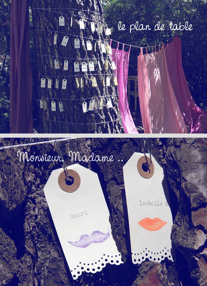 Rien de bien original, j’ai vachement copié sur les sites américains (qui rappelons-le sont une énorme source d’inspiration..) Tout a été tapé à la machine à écrire et les tampons ont été faits à la main. Une jolie paire de lèvres pour les dames et une chouette moustache pour ces messieurs.  Le nom des tables était au verso. Et puis tous les prénoms étaient rangés par ordre alphabétique. Super facile ! Mais à savoir que certains n’ont même pas cherché le plan de table et ont fait des tours et des détours avant de trouver leurs places.. !