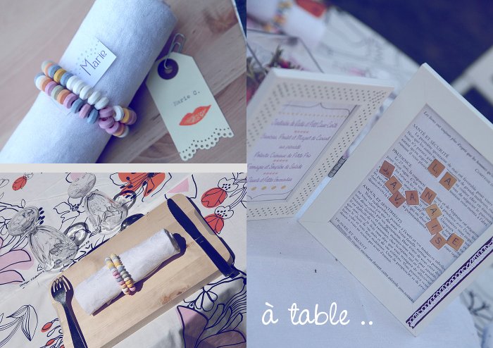 Chaque table comportait le nom d’une chanson francophone. Nous avons décoré chaque cadre qui comportait le menu et le nom de la table. Pour attacher les marque-place, les fameux colliers de bonbons. (idée copiée également du net archi vue et revue mais j’adorais l’idée..).