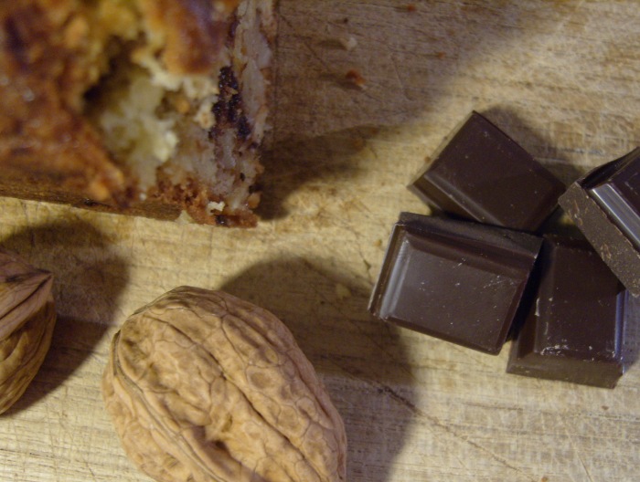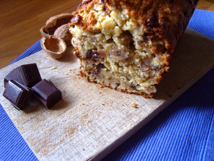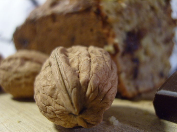Écraser les bananes à la fourchette et les ajouter au mélange précédent. Ensuite, couper le chocolat en morceaux pas plus gros qu’un centimètre de côté et hacher les cerneaux de noix. Les ajouter au reste des ingrédients et mélanger avec une cuillère en bois.