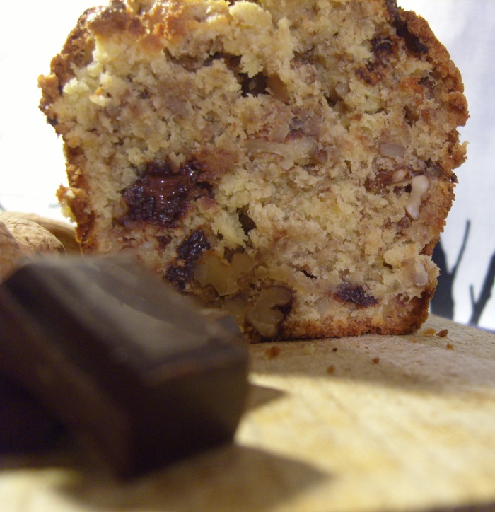 Comme son nom l’indique c’est un gâteau (? en tous cas ça n’avait pas l’air d’être du pain) au chocolat et à la banane. Et puis y’a même des noix pour ceux qui aiment ça. La recette ressemble à quelques exceptions près à celle des muffins bananes chocolat noix de pécan réalisée au mois de Mars dernier. (Je ne fais que constater … peut-être que les gens de Saveurs sont des petits copieurs, qui sait..!)
