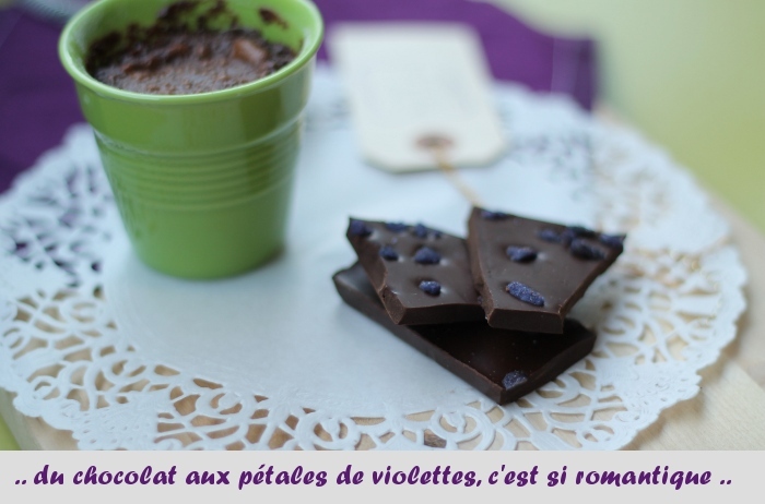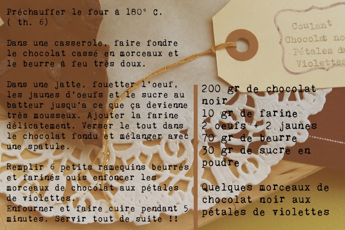 Aujourd’hui, rien de bien fantastique mais un dessert tout simplement parfait pour cet été qui est loin d’être caniculaire. Un coulant au chocolat noir(et non pas un moelleux ahahaha). La petite particularité, c’est ce mélange étonnant aux pétales de violettes. Attirant tant par l’originalité que par l’odeur très prenante de ces petites fleurs.