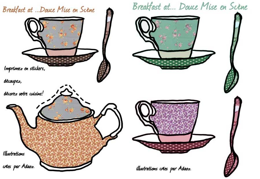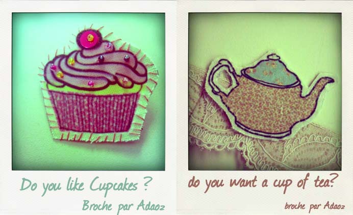 Ce matin, Clémence m’a envoyé plusieurs petites choses: les broches cupcake et théière que vous pouvez voir sur les polas ci-dessus ainsi que des jolies illustrations: