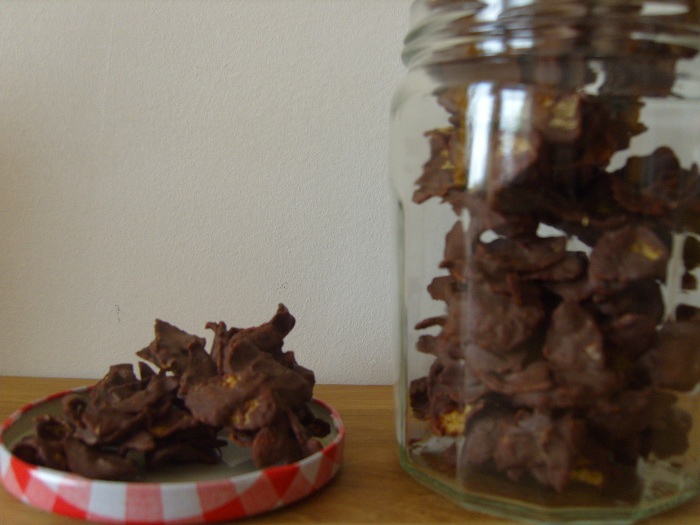 La semaine dernière, Fabou m’a envoyé sa participation au jeu sauf que nous avons eu un petit soucis de photo, d’organisation et de manque de temps donc je lui ai dit que je ferais sa recette afin de pouvoir refaire des photos et la poster ici de façon à illustrer sa  contribution. Pour ce qui est de ces bouchées, je peux vous dire que la simplicité est au rendez-vous. Du chocolat, des corn flakes et le tour est joué. Je vous mets la recette à la suite pour les intéressé(e)s. Je ne dirai pas si c’est bon pour des raisons évidentes: ce ne serait pas juste pour les autres participations sucrées, faut bien que je reste impartiale  !!
