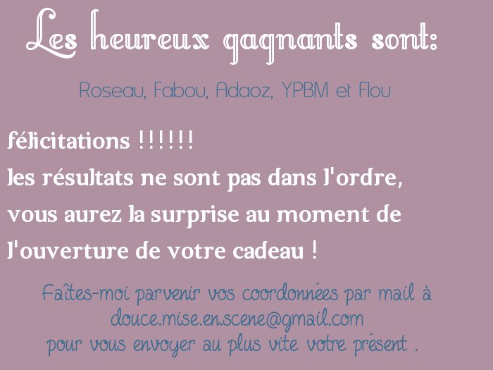 Les heureux gagnants sont …. http://www.doucemiseenscene.fr/2010/07/02/les-heureux-gagnants-sont/ http://www.doucemiseenscene.fr/2010/07/02/les-heureux-gagnants-sont/#comments Fri, 02 Jul 2010 17:52:14 +0000 Céline http://www.doucemiseenscene.fr/?p=3943 ]]>