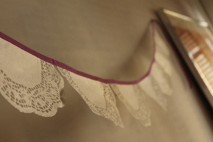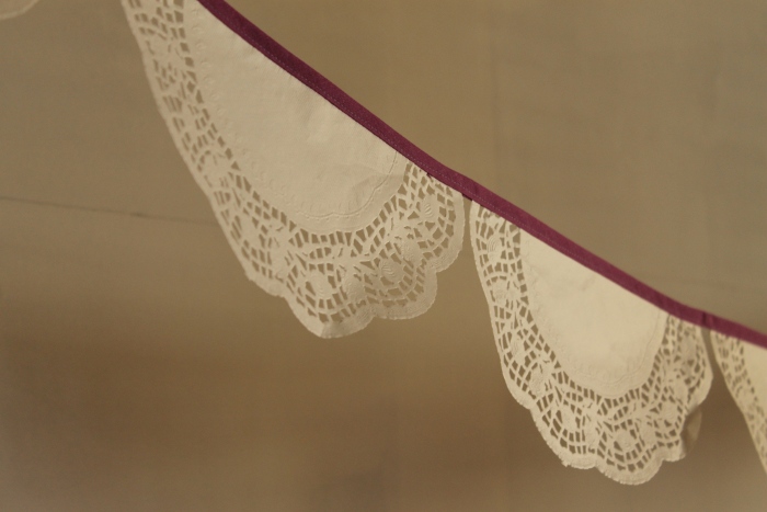 Les napperons achetés pour les créer les enveloppes des faire-parts venaient en deux tailles différentes. Je me suis donc retrouvée avec une bonne soixante d’exemplaires, ne sachant pas quoi faire avec . C’est ainsi que pour égayer un petit peu le petit bois et le lieu de la cérémonie, j’ai décidé de les utiliser pour créer des guirlandes.