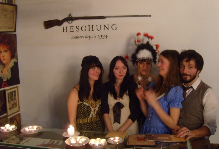 Hier, j’ai assisté pour la première fois à un concert dans une boîte à chaussures. Des souliers Heschung que l’on trouve à Lyon depuis 1934. Un chef indien nous a tenu la porte et nous a prié de nous asseoir confortablement tous autant que nous étions, parmi les chaussures. Plein de chaussures. Mais également des cadres, des animaux, des cartes de biologie, des enfants pleureurs. Du sol au plafond.
