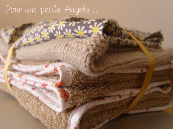 Petite cousine née en Février Avril dernier, je me suis régalée à lui confectionner trois petites choses délicates en attendant de faire sa connaissance prévue au mois d’Août lors du mariage ( du côté de la famille de Cyp) auquel nous étions invités à Orléans.
