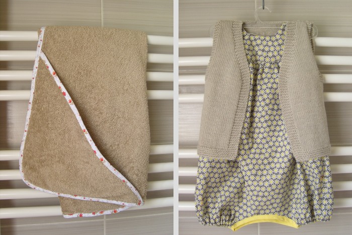 Une barboteuse comme celle montrée il y a quelques mois, accompagnée de son petit gilet (tricoté avec amour!) et une sortie de bain (une première pour moi, en terme de couture pour bébés !) avec un adorable biais parsemé de petites fleurs. N’est-ce pas trop mimi ?