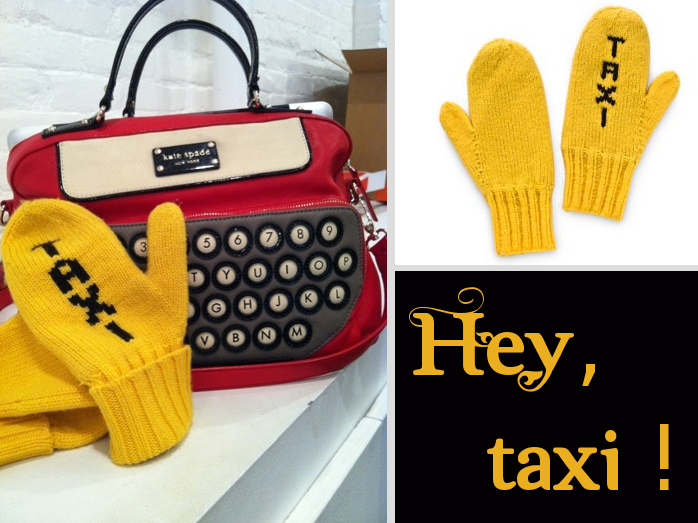 Hier sur twitter, Kate Spade, designer américaine que je suis, (j’aime beaucoup son travail, ce qu’elle crée, ses bijoux et tout un tas de choses. Je vous invite même à aller fureter sur son site web si vous ne le connaissez pas.) a partagé une photo de ses Big Apple Taxi Mittens et ce fut le gros coup de coeur.